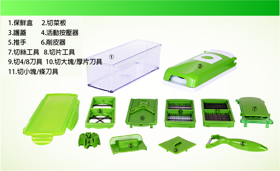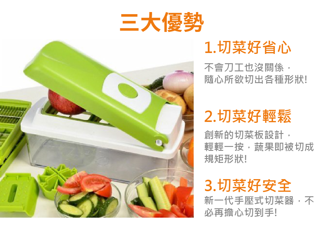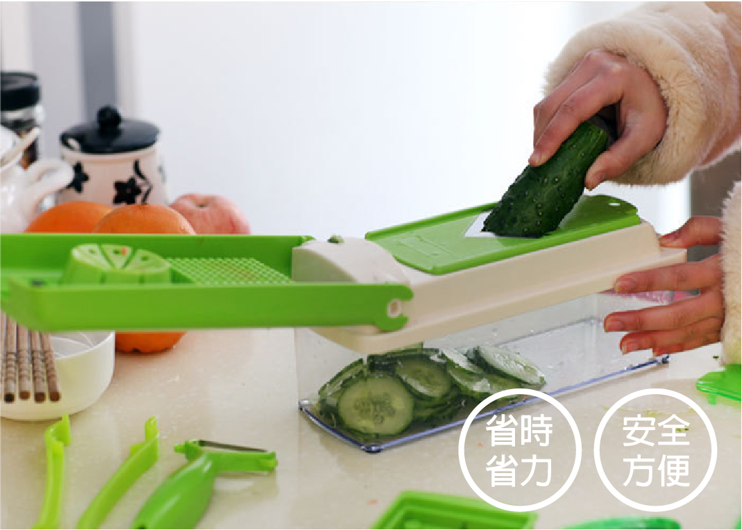 【切菜神器】10件廚房多功能切菜器/刨絲切果器切片削皮切菜器10件套。限時特價買二送一,僅需NT$1199。從此告別刀切菜時代,粗絲、細絲、厚片、薄片、切花、磨蓉六大功能,各類食材,都能輕輕鬆鬆的搞定,讓您下廚更輕鬆。